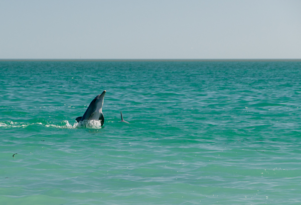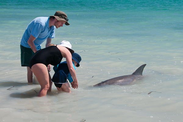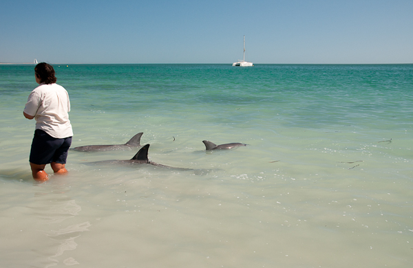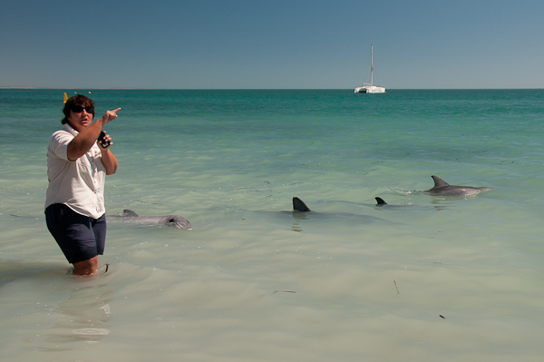 The next day, we stocked up with supplies and drove the 1/2 hour to Monkey Mia, where there is a self contained holiday resort (which we didn’t want to stay at, as there is only one restaurant and nothing else to do). The interesting thing about Monkey Mia is that for 30 years or more, dolphins have been coming in to the beach to be fed. This got a bit out of hand in the 80’s so the Environment Department guys created a managed feeding program. 3 times a day, in the mornings only, dolphins swim in and get fed a small ration of fish. The DoE guys pick members of the public to come and feed them – its very cool.