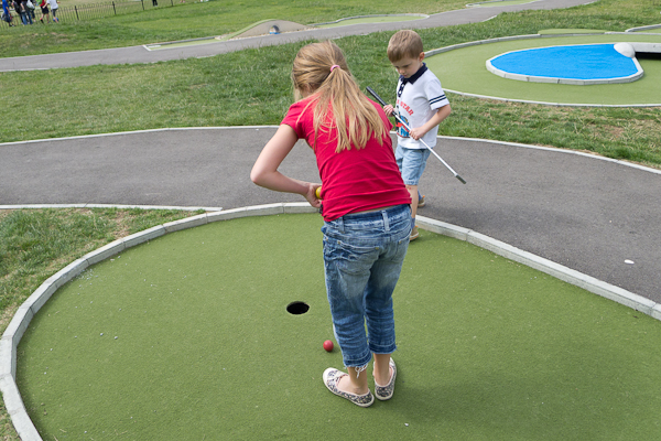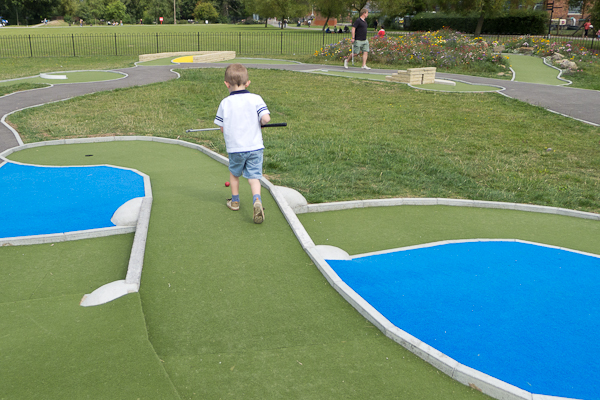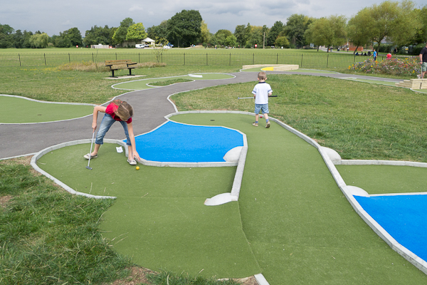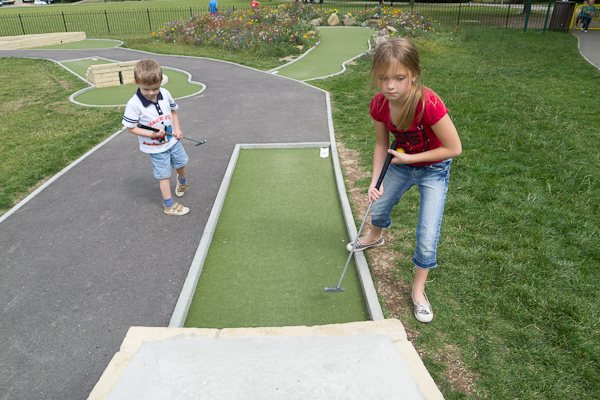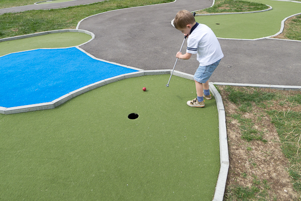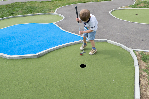 The kids were a bit tentative on the play equipment, but were happy to give the golf a go with the promise of ice creams afterwards.  Henry swore blind that he could do golf just fine without my help, but after twice whacking himself in the shins, asked for a bit of help.
