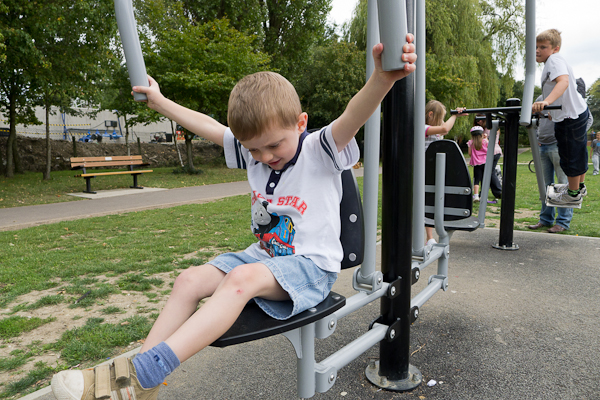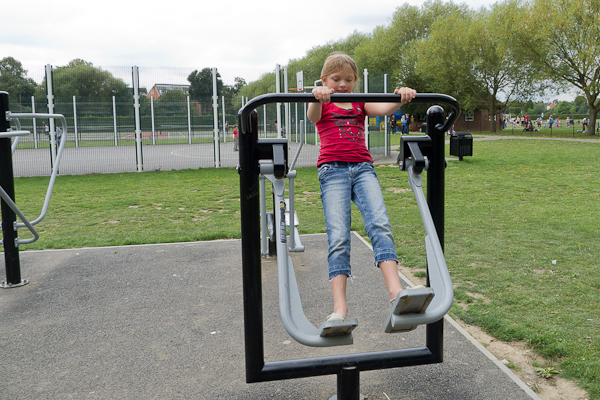One of the other parts of the park had exercise equipment, which the kids loved – trying to pry them off was interesting!