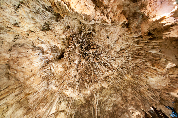 Its 10 meters down through the only opening into the cave – it opens out to a wide platform overlooking a large cavern topped with thousands of stalactites. Its pretty humid in the cave, with CO2 levels also pretty high making it harder to breathe and clamber about. In the main cavern it’s pretty open and you can look up at the roof at all the thousands of needles pointing down at you.