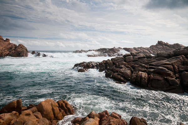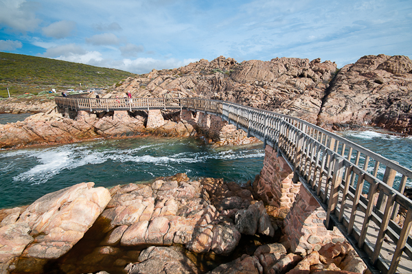 Its an outcrop of 700 million year old pinky coloured granite gneiss which has long joint lines that form ‘canals’ through the rocks. There’s a little wooden bridge out from the land to the first major block of rock and you can see the water rushing in and out as the large waves pound on the outer rocks, filling the canals with water. It’s quite impressive.