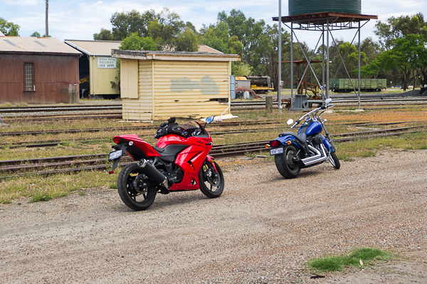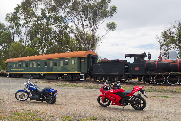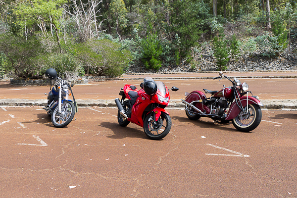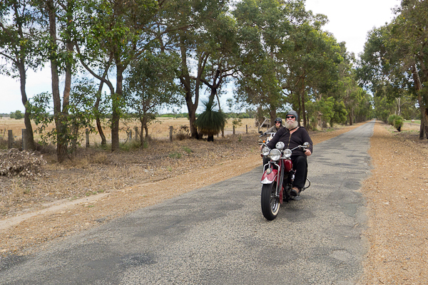 We headed out to Serpentine, Pete on his deafeningly loud Harley Night Train, his Dad on a 1940’s Indian Chief and me on the little Kawasaki.  Talk about the odd one out!