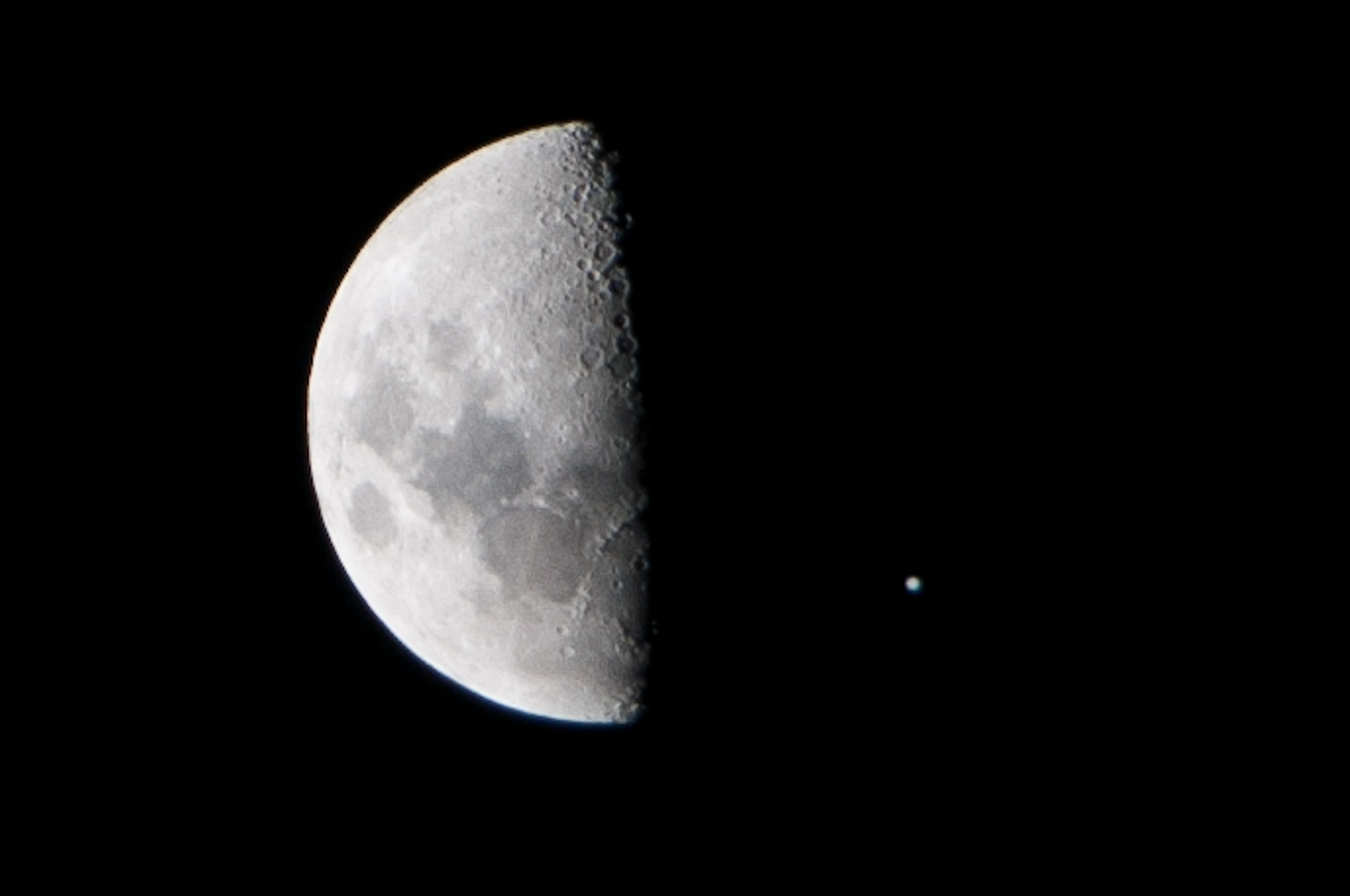 Last month, Jupiter and the moon has a little dalliance – an astronomical game of kiss chase.    Jupiter was actually occulted (obscured, hidden – not vanished using dark magic) by the moon the next day, but I forgot to go out and get the picture!