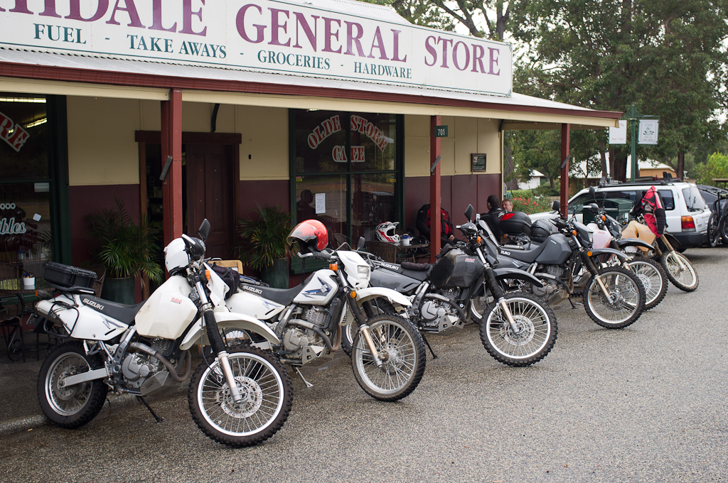 Six Suzukii (well it’s not Suzukis) met up outside the Jarrahdale General Store on a rainy Sunday morning. Time for the mighty DR6550’s (and a DRZ) to show the forest ‘what for’