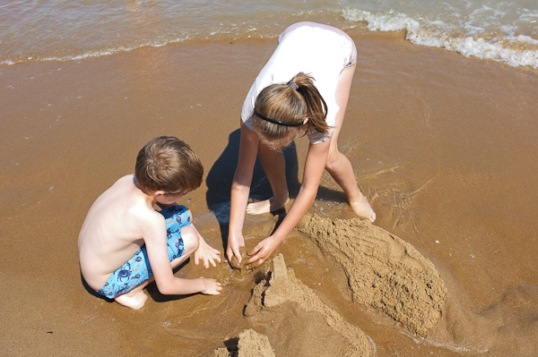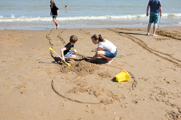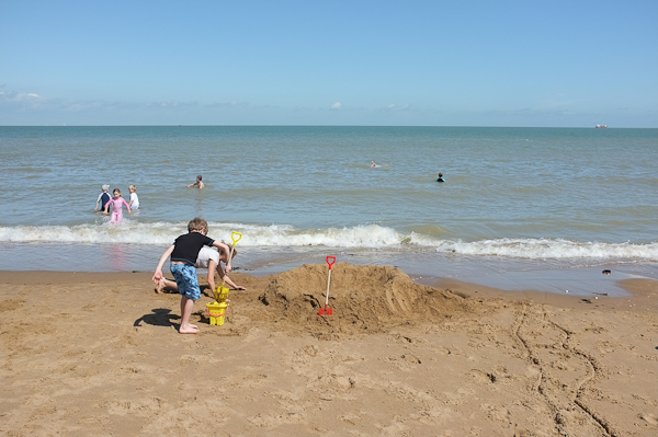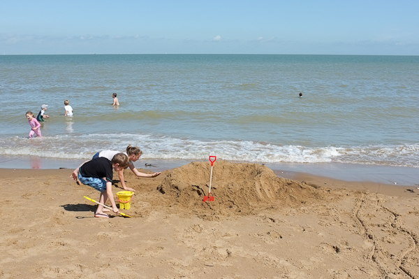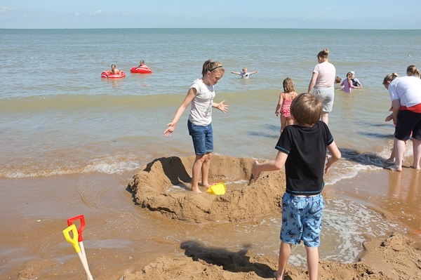 With the tide coming in, it was time to build some sea defences. I bought them spades and a bucket to make it easier and we began construction on some serious tide prevention.