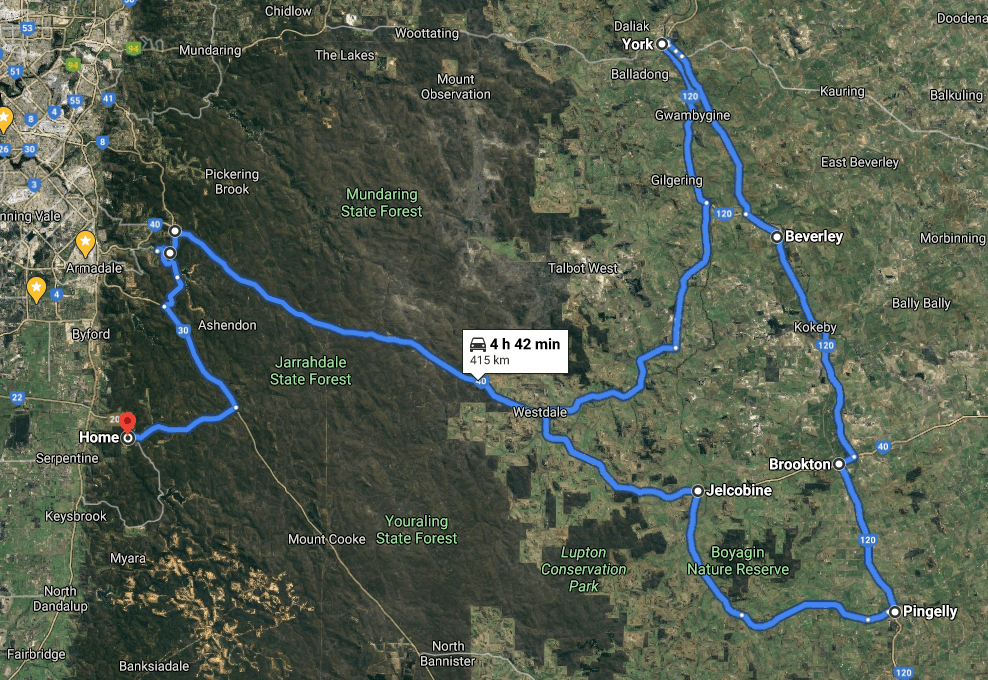 So I fuelled up the car and headed off on a little round trip inland to York, Beverley, Brookton and Pingelly to see what I could find. The route took me through the seemingly endless state forest and then out into the first part of the wheatbelt.