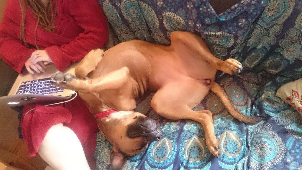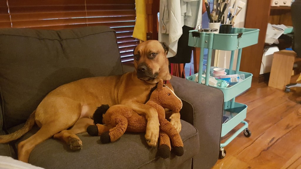 Even on the first day she came home, which must have been super confusing for her, she settled into life with us well. She raced around the garden and played tug of war with the rope, she loved the cats and she sat on us constantly. There were no negative behaviours, she wasn’t aggressive, she was very affectionate, wasn’t destructive, didn’t have any health issues, was good with the cats. So I felt like we’d hit the dog jackpot.