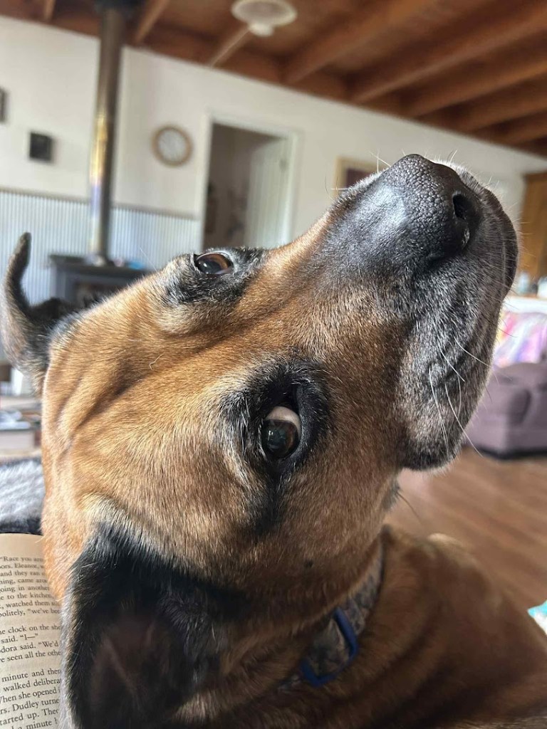 When she would gruffle and bark for more if we stopped patting her with an exaggerated ‘no more pats’