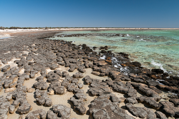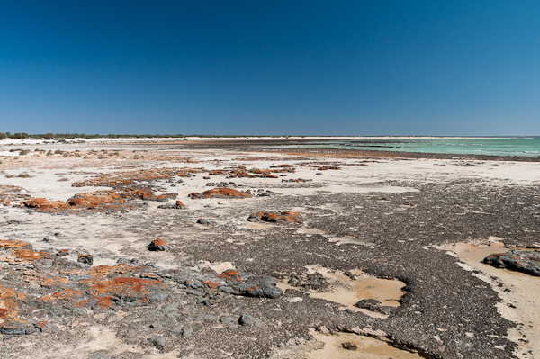 We turned off the highway and onto the road to Denham – there’s still an hour or so of solid driving to go from that point, but we were making good time so we stopped off at Hamelin Pool, a tiny homestead and former telegraph station at the bottom of Shark Bay. It’s famous for its Stromatolites, which are rock like structures, formed from the actions of tiny cyanobacteria that grow in the hyper-saline waters, slowly trapping sand and mud which forms new layers, growing only few mm a year.