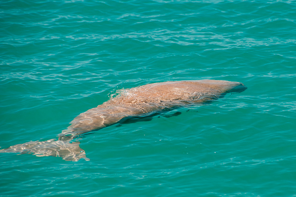 It was a gorgeous day so we pottered around a bit more in search of dugongs. Dugongs are funny things – they’re mammals that graze on the sea grass meadows in the shallow waters. Shark Bay has about 20% of the world’s population – something like 15000 of them live here, happily pottering about in the shallow water. They spend a fair bit of time sleeping, and like dolphins, send 1/2 their brain to sleep at a time, keeping one half awake to deal with breathing and keeping a watch out for sharks. They sleep just on the surface so we sailed slowly about to try to spot one. They’re very shy, so we kept on seeing tails pop out of the water and they swam back down out of harms way.